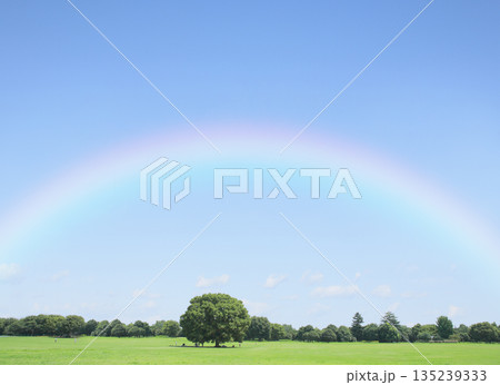 青空と草原にかかる虹 希望・未来・ボジティブイメージ
