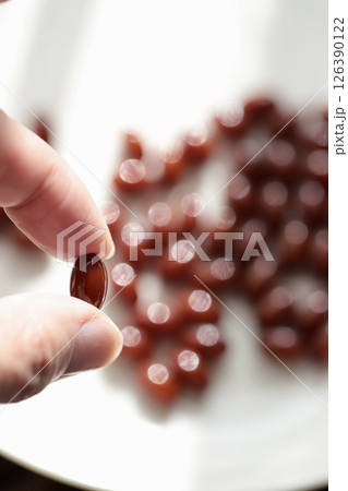 プラセンタサプリメントを一粒つまんでいる50歳代女性の指