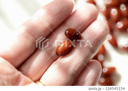 プラセンタサプリメントを2粒を乗せた50歳代女性の指先