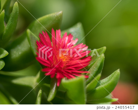日本の秋の庭に咲く赤いハナヅルソウの花と肉厚の黄緑色の葉