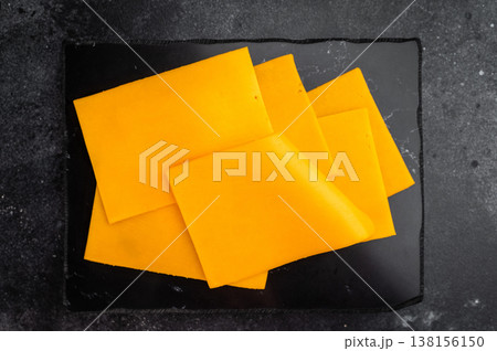 Cheddar cheese slices arranged on dark board top view dairy product texture and modern food background with copy space