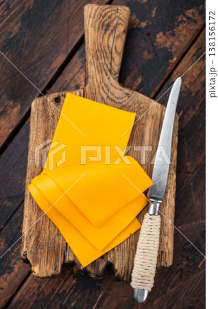 Stack of orange cheese slices on board with knife dark wooden background dairy ingredient for sandwiches burgers and cooking