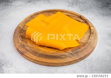 Stack of orange cheese slices on round plate minimal food composition with copy space for menu design or recipes