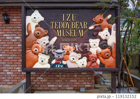 [伊豆・静岡] 沢山のテディベアが彫られた伊豆テディベア・ミュージアムの木製看板。