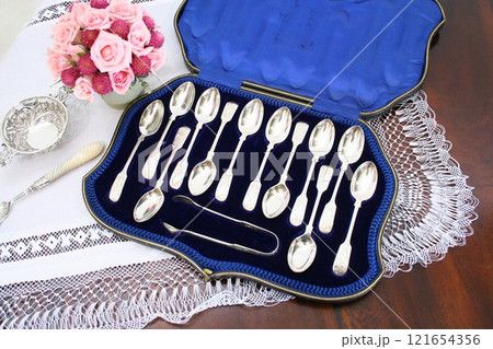 箱に入った純銀製のアンティークのティースプーンとトングのセット