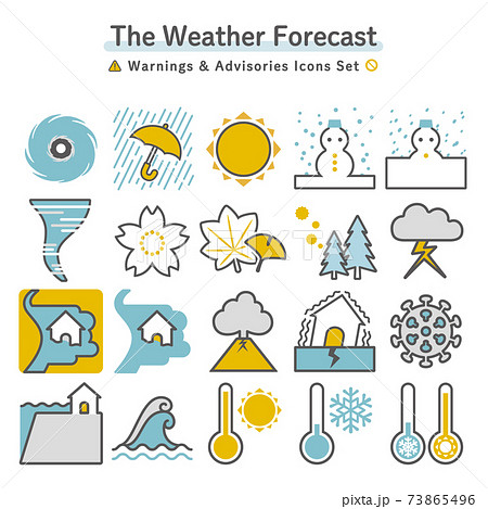 天気予報(警報・注意報・前線)・災害情報のアイコンセット 3C ベタ&線画