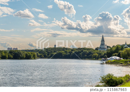 Church of Anscension and the Moskva River in Kolomenskoye park in Moscow, Russia