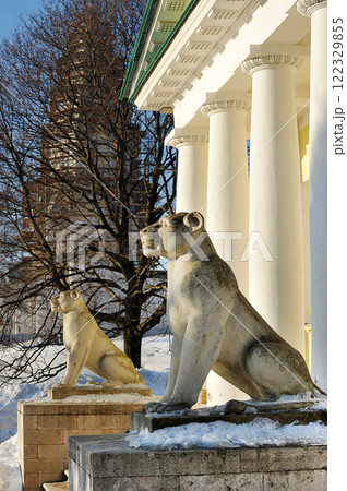 view of the historic building with lions in Kolomenskoye Park in Moscow