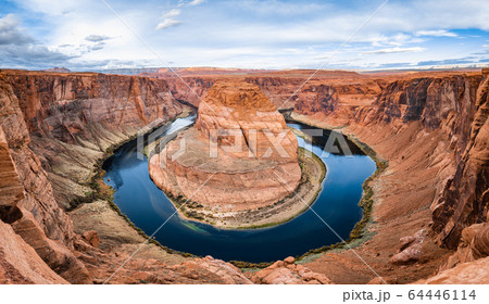 Horseshoe bend canyon giant stone loop panoramic view, looking down at Colorado river bend and red rock canyon, standing walls on the edge.