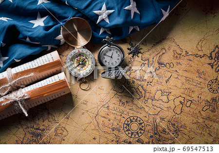 Columbus Day concept. Vintage compass and pirates treasure manuscript with copy space background