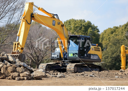 工事現場の油圧ショベル