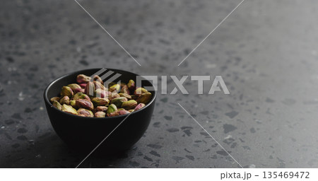 peeled pistachios in black bowl on terrazzo surface