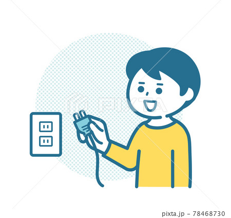 壁に取り付けられたコンセントにプラグを挿し込む日本人男性のイラスト素材