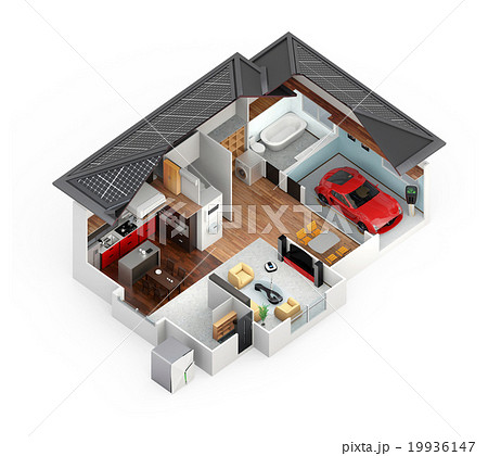 スマートホームのインテリア。省エネ家電製品によるエネルギー消費減と太陽光発電で売電できる