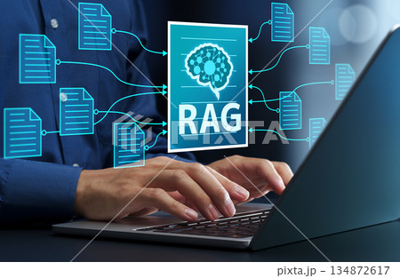 検索拡張生成RAG。企業内部ドキュメントのセマンティック検索。AIチャットボットアイコンを持つビジネ