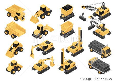 Construction equipment isometric elements constructor mega set. Creator kit with flat graphic concrete machinery, dump trucks, excavators, trolley, cranes. Vector illustration in 3d isometry design