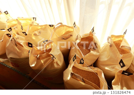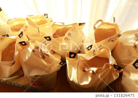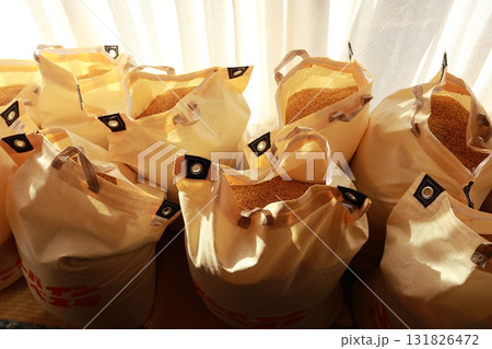 脱穀、収穫されて、昔ながらに縁側で優しく天日干しされる新米の籾