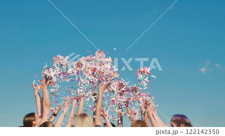 High school graduates joyfully tossing vibrant confetti into the air against a backdrop of clear blue skies