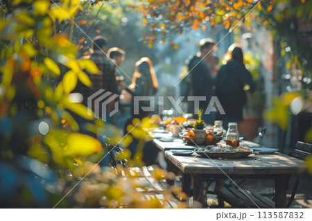 Outdoor cafe table with food, blurred people in background. Spring landscape. Local sitting cafe, picnic