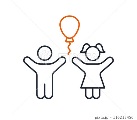 Icon of a boy and girl with a balloon, symbolizing childhood joy and playfulness. Vector illustration. Editable stroke.