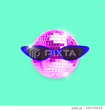 Creative pink disco shaped ball in bright blue summer glusses with flash effect sparkle and shine over vivid cyan background.