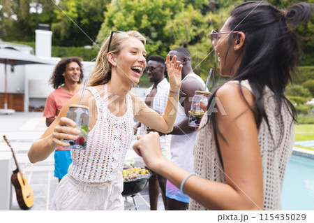Group of friends clinking glasses with cocktails against the backdrop of a swimming pool