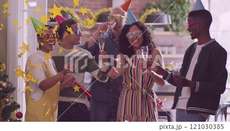 Image of stars over diverse friends at party
