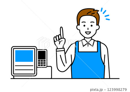青いエプロンを着て腕組みと直立をする男性店員の全身イラスト