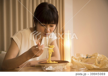 会社のデスクでナポリタンパスタを食べるミドル女性