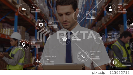 Image of data processing against caucasian male supervisor using digital tablet at warehouse