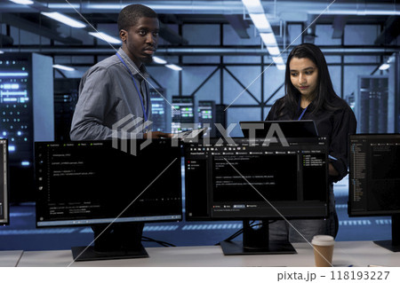 Technicians in data center using devices to check for server performance issues arising due to high CPU usage. Server farm staff members fixing insufficient memory errors slowing down hardware