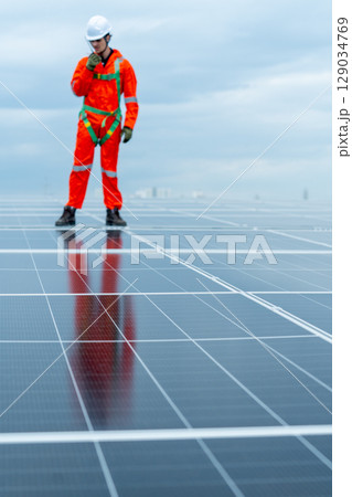 Vertical image with main focus on solar cell panel with technician worker or professional engineer stand and use walkie-talkie during check and maintenance.