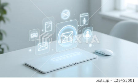 Holographic Email and Digital Communication Icons Above a Laptop.