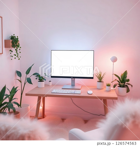 Pastel desk setup, soft light, wood and tech, indoor plants, dreamlike Scandinavian mood.