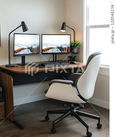 A modern office features a white-screen computer mockup and accessories arranged on a table.