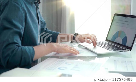 Professional working at laptop with data analysis charts. Businessman analyzing statistical data on a laptop next to business reports. Business concept
