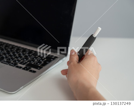 A woman smokes an electronic cigarette while working on a laptop. Tobacco heating system.