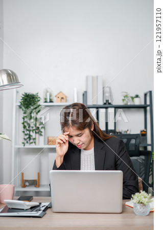 Smiling young asian businesswoman using laptop to work online, remote work.