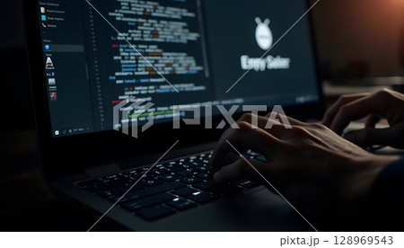 Close-Up of Hands Typing on Laptop Keyboard with Code Displayed in Low Light Environment