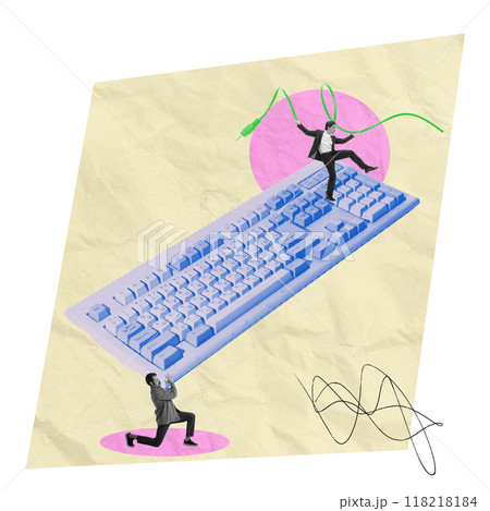 Businessman balancing on keyboard holding cables, while another holding it. Technology and productivity. Contemporary art collage.