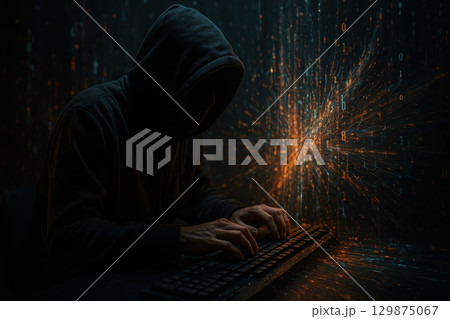 Hacker in dark hoodie typing on keyboard with digital code and hack concept glowing around, symbolizing cyber hack and data breach in technology