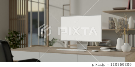 A minimalist white Scandinavian office room with a white-screen PC computer mockup on a wooden table