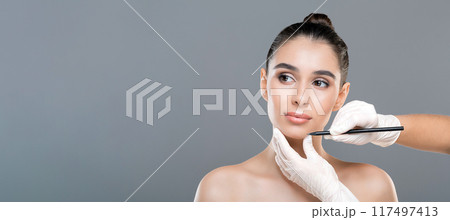 A young woman is receiving a facial contouring treatment from a professional, who is wearing gloves and using specialized tools. The woman appears relaxed and confident, copy space