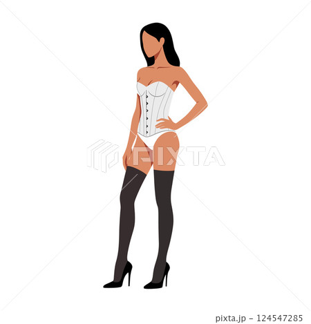 Elegant woman in stylish corset and thigh-high stockings, showcasing confidence in a minimal flat design vector illustration