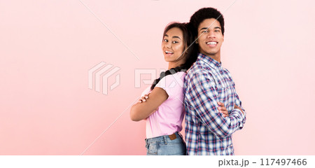 A young black couple stands against a vibrant pink backdrop, striking a pose for the camera. Both individuals exude confidence and style as they showcase their love and bond