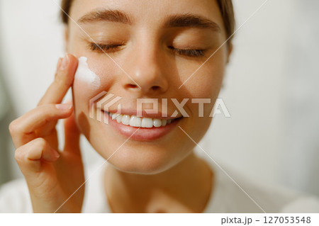 Skincare Routine Happy Woman Joyfully Applying Moisturizer in Her Bathroom Area