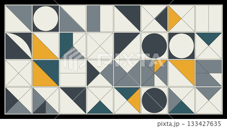 バウハウス風の幾何学的なグリッドパターン、円と三角形を組み合わせたモダンなベクター抽象画