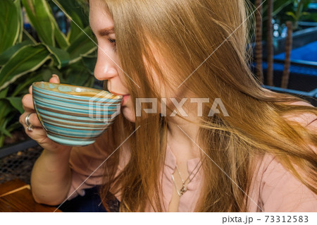 Blonde in cafeteria with cup of coffee. She is touching her chick by her fingers on the background of plants.