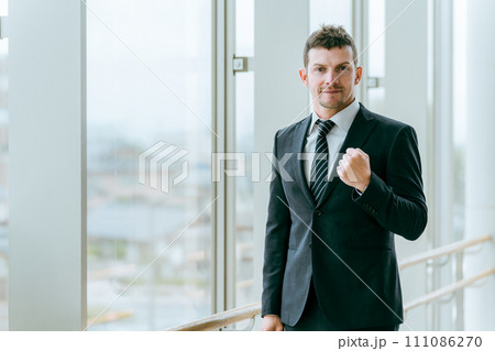 ガッツポーズをする外国人ビジネスマン(白人男性・応援・成功・やる気・期待・やりがい)