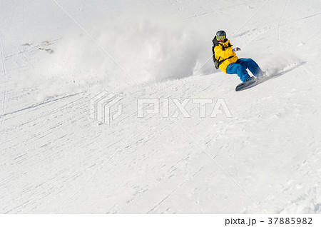 Snowboarder on off-piste slope with new fallen snow